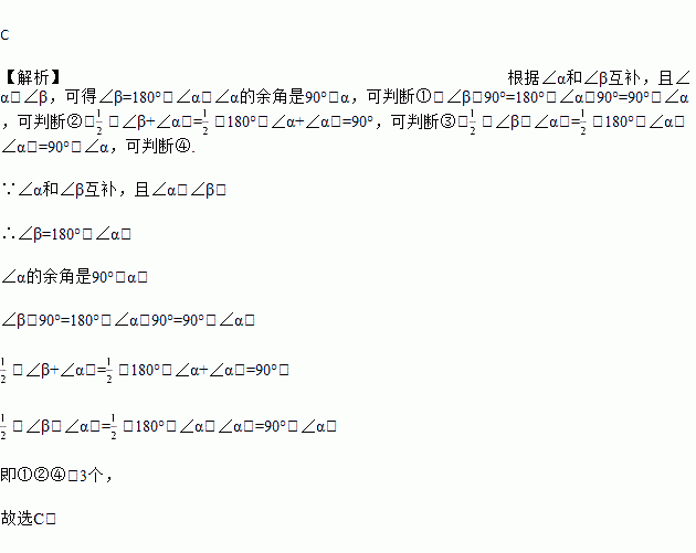 如果∠α和∠β互补,且∠α<∠β,下列表达式:①90°﹣∠α;②∠β﹣90°;③(∠β+∠α);④(∠β﹣∠α)中,等于∠α的余角的式子有( )