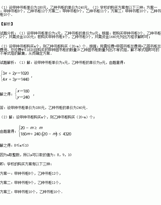 (2)若该校计划购进这两种规格的书柜共20个,其中乙种书柜的数量不少于甲种书柜的数量,学校至多能够提供资金4320元,请设计几种购买方案供这个学校选择.