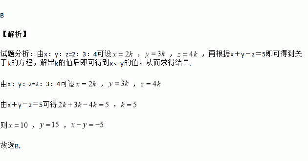 若x:y:z=2:3:4,且x+y-z=5,则x-y的值是( )