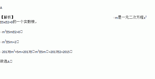 A 【解析】∵m是一元二次方程x2﹣5x﹣2=0的一个实数根, ∴m2﹣5m﹣2=0, ∴m2﹣5m=2, ∴2017﹣m2+5m=2017﹣(m2﹣5m)=2017﹣2=2015. 故选A.