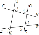 分析:根据:∠1=∠2,利用等量代换求证∠1=∠5,再求证AB∥CD,再利用两直线平行,同旁内角互补即可求解.