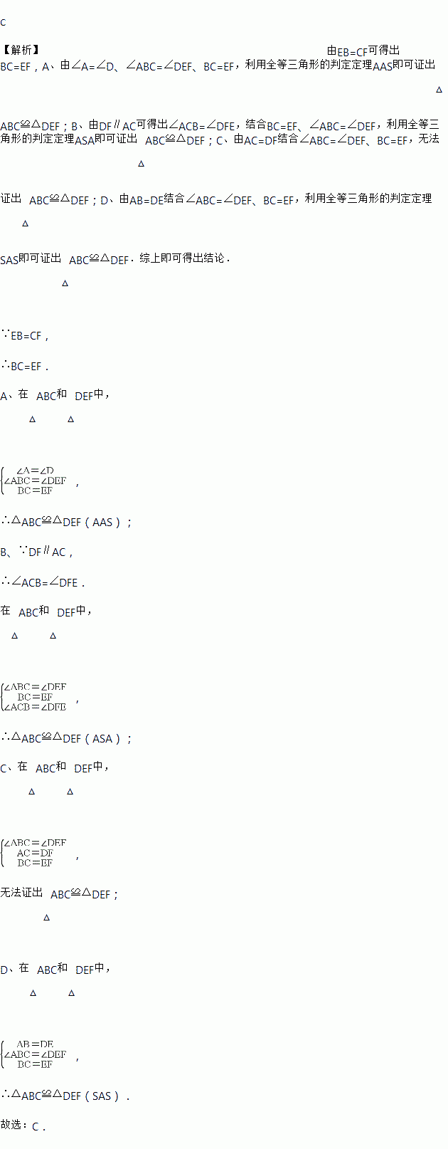 A. ∠A=∠D B. DF∥AC C. AC=DF D. AB=DE