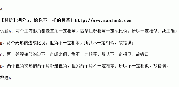 A. 两个正方形一定相似 B. 两个菱形一定相似