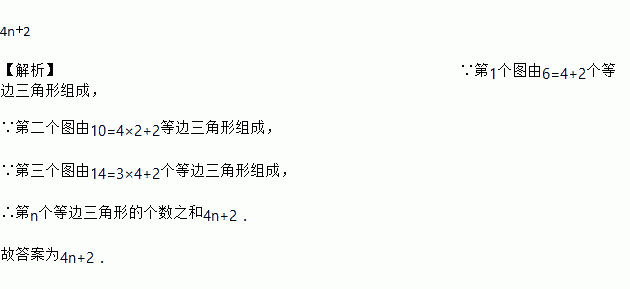 下列图形由正六边形、正方形和等边三角形组成,自左向右,第1个图中有6个等边三角形;第2个图中有10个等边三角形;第3个图中有14个等边三角形组成;…按照此规律,第n个图中等边三角形的个数为_____个.