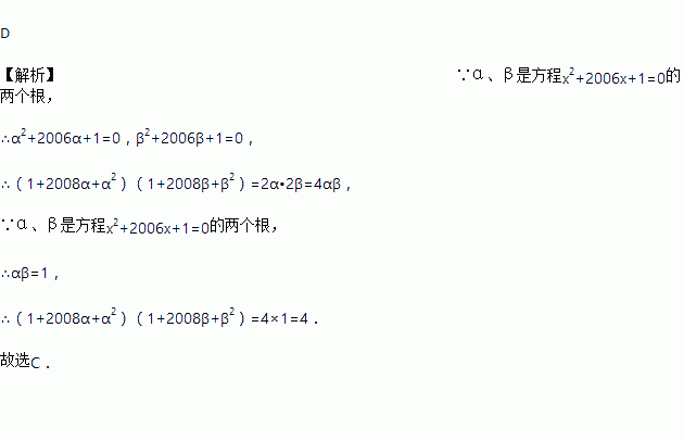 已知α,β是方程x2+2006x+1=0的两个根,则(1+2008α+α2)(1+2008β+β2)的值为( ).