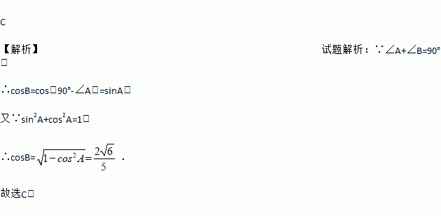 已知∠A+∠B=90°,且cosA=,则cosB的值为( )