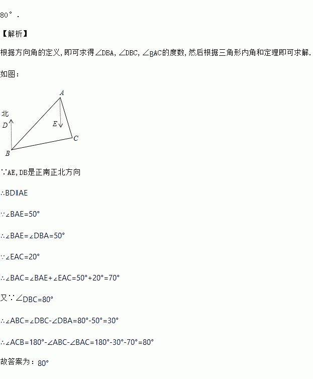 如图,B处在A处南偏西50°方向,C处在A处的南偏东20°方向,C处在B处的北偏东80°方向,则∠ACB=_____.