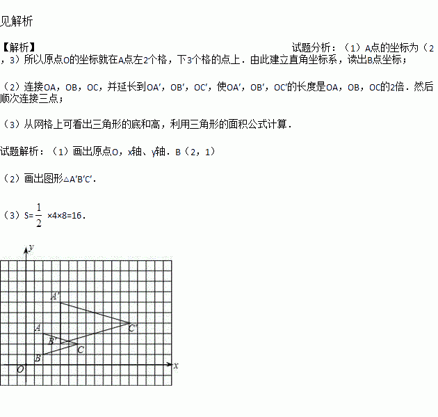 (1)请在方格纸上建立平面直角坐标系,使A(2,3),C(6,2),并求出B点坐标;