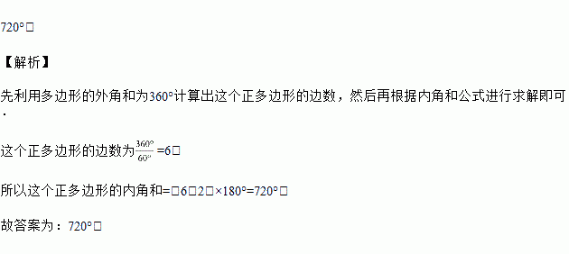一个正多边形的每个外角为60°,那么这个正多边形的内角和是_____.