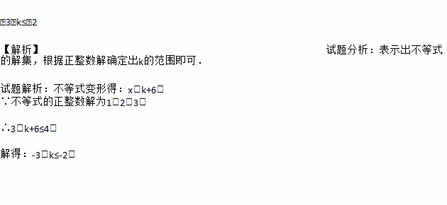 ﹣3<k≤﹣2 【解析】试题分析:表示出不等式的解集,根据正整数解确定出k的范围即可. 试题解析:不等式变形得:x<k+6, ∵不等式的正整数解为1、2、3, ∴3<k+6≤4, 解得:-3<k≤-2.解不等式组:
