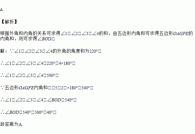 如图的七边形ABCDEFG中,AB,ED的延长线相交于O点,若图中∠1,∠2,∠3,∠4的外角的角度和为220°,则∠BOD的度数为何?( )