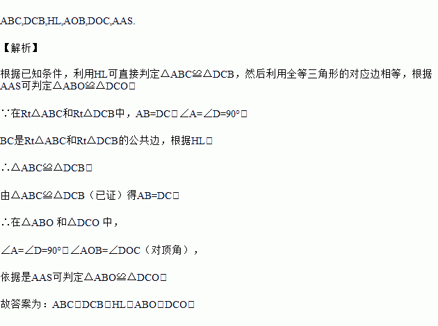 如图,在Rt△ABC和Rt△DCB中,AB=DC,∠A=∠D=90°,AC与BD交于点O,则有△________≌△________,其判定依据是________,还有△________≌△________,其判定依据是________.
