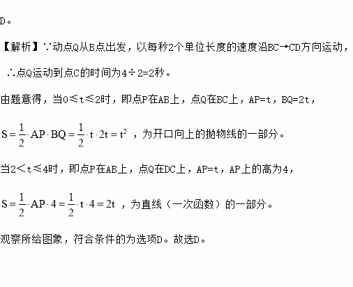如图,在边长为4的正方形ABCD中,动点P从A点出发,以每秒1个单位长度的速度沿AB向B点运动,同时动点Q从B点出发,以每秒2个单位长度的速度沿BC→CD方向运动,当P运动到B点时,P、Q两点同时停止运动.设P点运动的时间为t,△APQ的面积为S,则S与t的函数关系的图象是【 】
