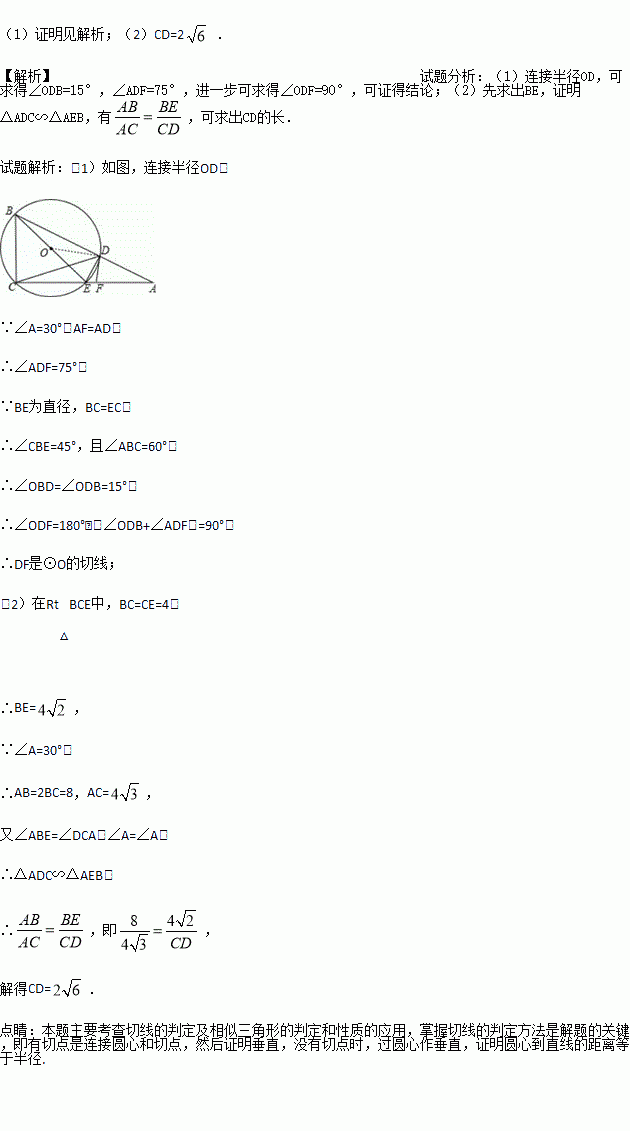 (1)求证:DF是⊙O的切线;