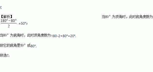 A. 50° B. 80° C. 50°或80° D. 20°或80°