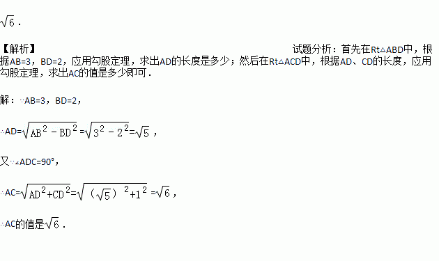 如图,在△ABC中,AD⊥BC于D,AB=3,BD=2,DC=1,求AC的值.
