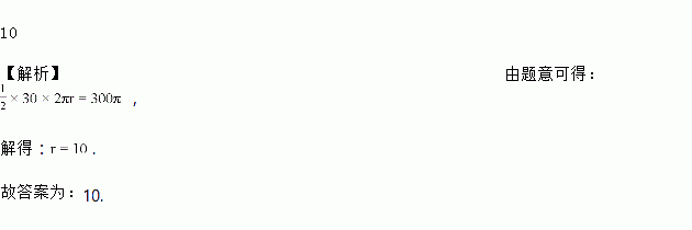 用一个半径为 30cm,面积为 300πcm2的扇形铁皮,制作一个无底的圆锥(不计损耗),则圆锥的底面半径r为________cm