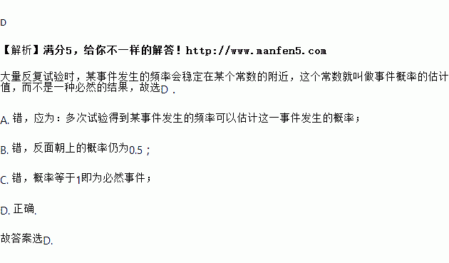 次掷出的硬币反面朝上的概率一定大于正面朝上的概率![]()