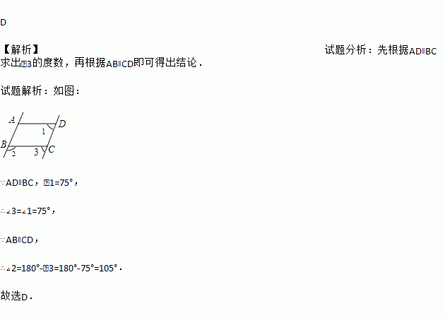 一只因损坏而倾斜的椅子,从背后看到的形状如图,其中两组对边的平行关系没有发生变化,若∠1=75°,则∠2的大小是( )