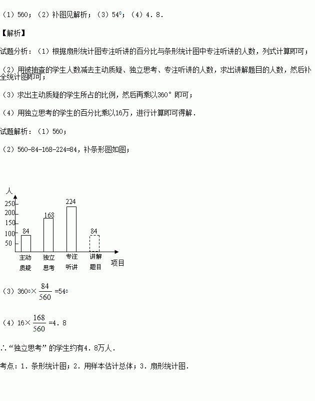 (4)如果全市有16万名初中学生,那么在试卷评讲课中,“独立思考”的学生约有多少万人?