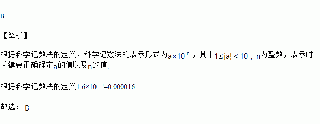 某桑蚕丝的直径用科学记数法表示为1.6×10-5米,则这个数的原数是