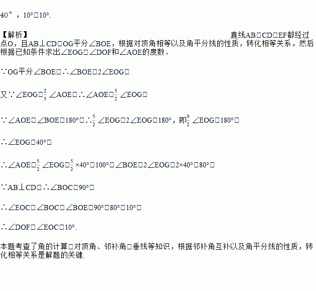 如图,直线AB、CD、EF都经过点O,且AB⊥CD,OG平分∠BOE,如果∠EOG=∠AOE,求∠EOG,∠DOF和∠AOE.