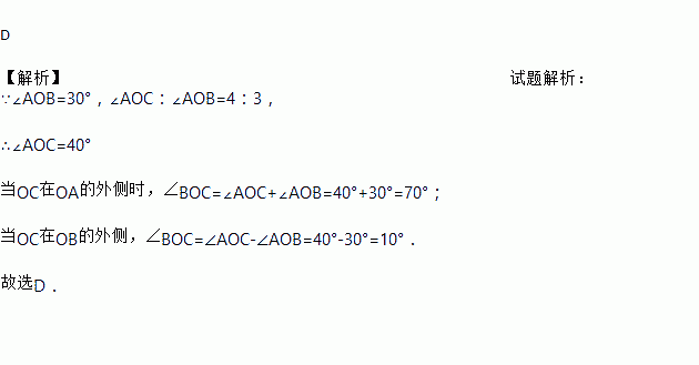 D 【解析】试题解析:∵∠AOB=30°,∠AOC:∠AOB=4:3, ∴∠AOC=40° 当OC在OA的外侧时,∠BOC=∠AOC+∠AOB=40°+30°=70°; 当OC在OB的外侧,∠BOC=∠AOC-∠AOB=40°-30°=10°. 故选D.