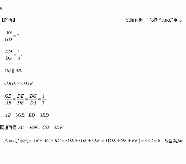如图,点G是△ABC的重心,GE∥AB交BC于点E,GF∥AC交BC于点F,若△GEF的周长是2,则△ABC的周长为_______.