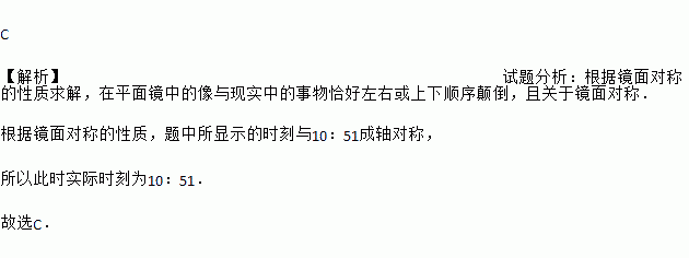 C 【解析】试题分析:根据镜面对称的性质求解,在平面镜中的像与现实中的事物恰好左右或上下顺序颠倒,且关于镜面对称. 根据镜面对称的性质,题中所显示的时刻与10:51成轴对称, 所以此时实际时刻为10:51. 故选C.
