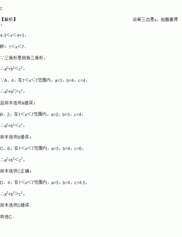 C 【解析】设第三边是x,由题意得: 4-3<x<4+3, 即:1<x<7. ∵三角形是锐角三角形, ∴a2+b2<c2, ∵A、4,在1<x<7范围内,a=3,b=4,c=4, ∴a2+b2>c2, 且故本选项A错误; B、2,在1<x<7范围内,a=2,b=3,c=4, ∴a2+b2<c2, 故本选项B错误; C、6,在1...