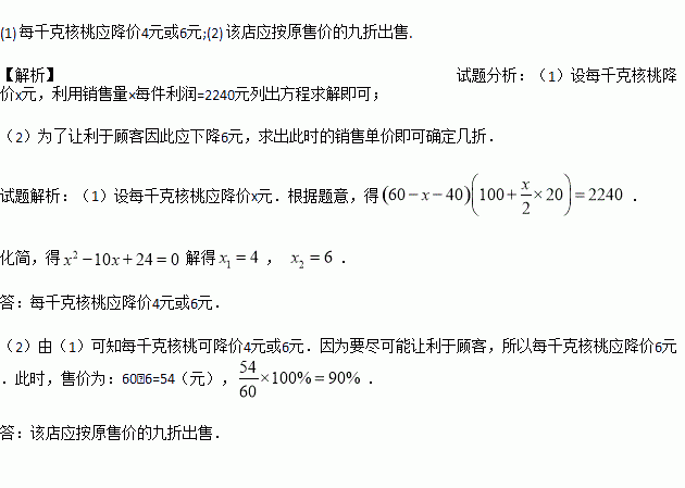 山西特产专卖店销售核桃,其进价为每千克40元,按每千克60元出售,平均每天可售出100千克,后来经过市场调查发现,单价每降低2元,则平均每天的销售可增加20千克,若该专卖店销售这种核桃要想平均每天获利2 240元,请回答: