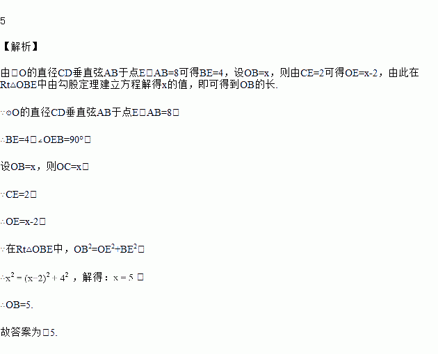 如图,⊙O的直径CD垂直弦AB于点E,且CE=2,AB=8,则OB的长为________.