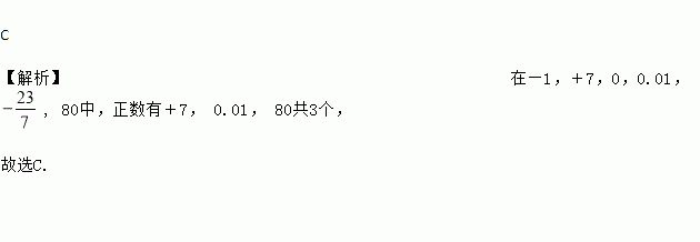 C 【解析】在—1,+7,0,0.01, , 80中,正数有+7, 0.01, 80共3个, 故选C.