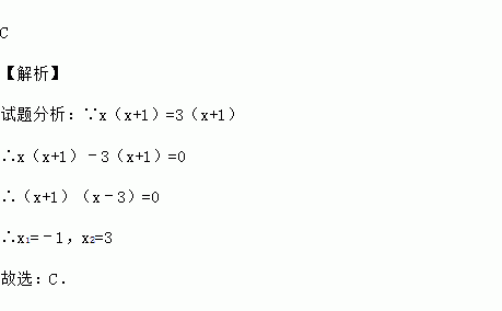 C 【解析】 试题分析:∵x(x+1)=3(x+1) ∴x(x+1)﹣3(x+1)=0 ∴(x+1)(x﹣3)=0 ∴x1=﹣1,x2=3 故选:C.已知:m,x,y满足:(1)