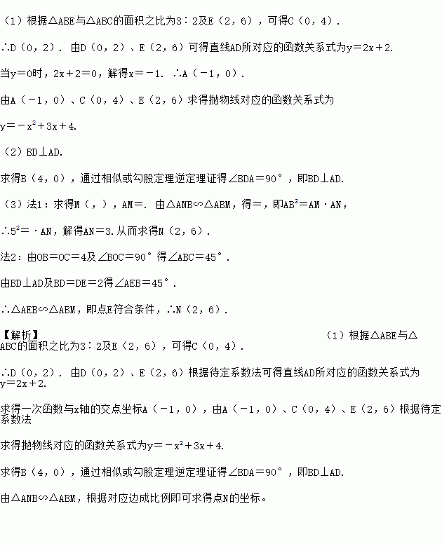 (1)根据△ABE与△ABC的面积之比为3∶2及E(2,6),可得C(0,4). ∴D(0,2). 由D(0,2)、E(2,6)可得直线AD所对应的函数关系式为y=2x+2. 当y=0时,2x+2=0,解得x=-1. ∴A(-1,0). 由A(-1,0)、C(0,4)、E(2,6)求得抛物线对应的函数关系式为 y=-x2+3x+4. (2)BD⊥AD. 求得B(...