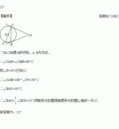 如图,PA、PB是⊙O的切线,A、B为切点,AC是⊙O的直径,∠P=50°,则∠BAC=______.