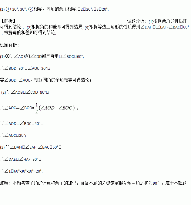 (3)如图3,将三个相同的等边三角形(三个内角都是60°)的一个顶点重合放置,若∠BAE=10°, ∠HAF=30°,则∠1= °.
