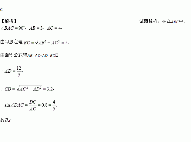 如图,在△ABC中,∠BAC=90°,AD⊥BC于D,若AB=3,AC=4,则sin∠DAC的值为( )