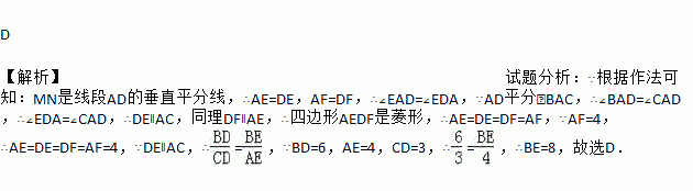 D 【解析】试题分析:∵根据作法可知:MN是线段AD的垂直平分线,∴AE=DE,AF=DF,∴∠EAD=∠EDA,∵AD平分∠BAC,∴∠BAD=∠CAD,∴∠EDA=∠CAD,∴DE∥AC,同理DF∥AE,∴四边形AEDF是菱形,∴AE=DE=DF=AF,∵AF=4,∴AE=DE=DF=AF=4,∵DE∥AC,∴=,∵BD=6,AE=4,CD=3,∴=,∴BE=8,故选D.