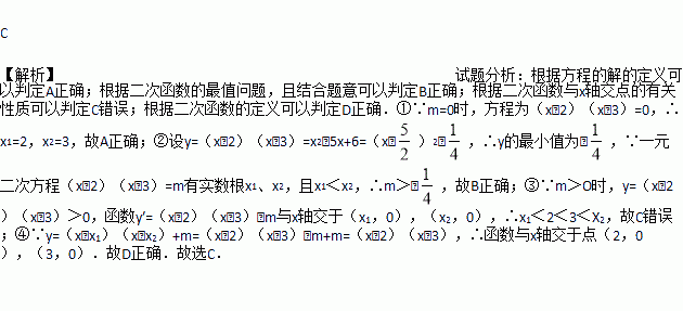 D. 二次函数y=(x﹣x1)(x﹣x2)+m的图象与x轴交点的坐标为(2,0)和(3,0)