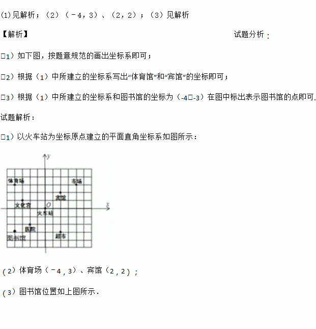 (1)请你以火车站为原点建立平面直角坐标系.