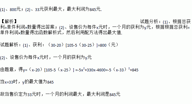 某商店经营一种小商品,进价为每件20元,据市场分析,在一个月内,售价定为25元时,可卖出105件,而售价每上涨1元,就少卖5件。