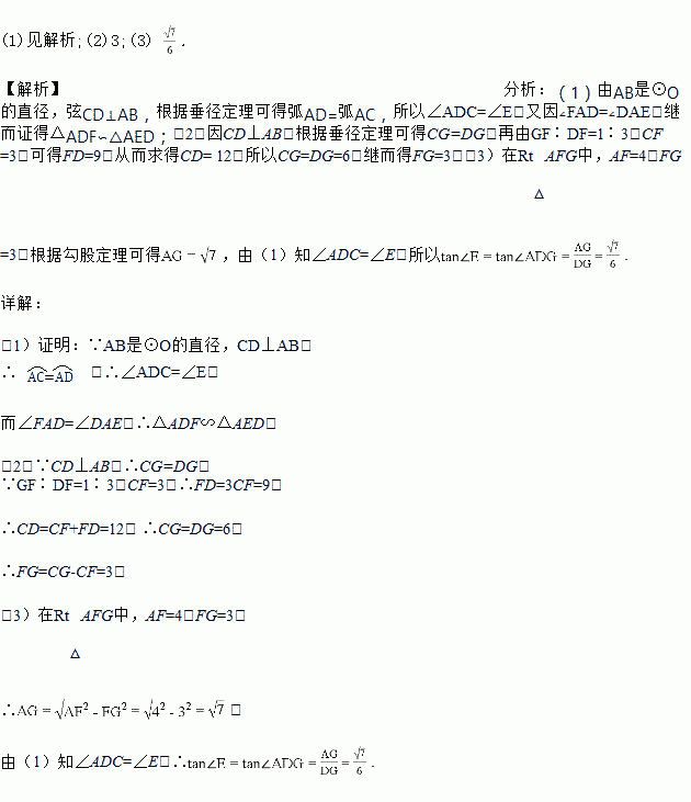 如图,AB是⊙O的直径,弦CD⊥AB于点G,点F是CD上一点,且满足CF∶DF=1∶3,连接AF并延长交⊙O于点E,连接AD、DE,若CF=3,AF=4.