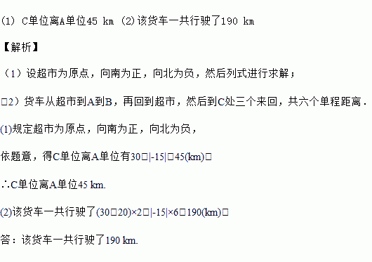一辆货车从超市出发送货,先向南行驶30 km到达A单位,继续向南行驶20 km到达B单位.回到超市后,又给向北15 km处的C单位送了3次货,然后回到超市休息.