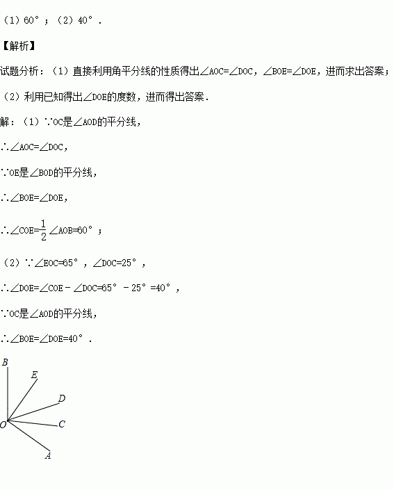 (2)若∠EOC=65°,∠DOC=25°,则∠BOE是多少度?