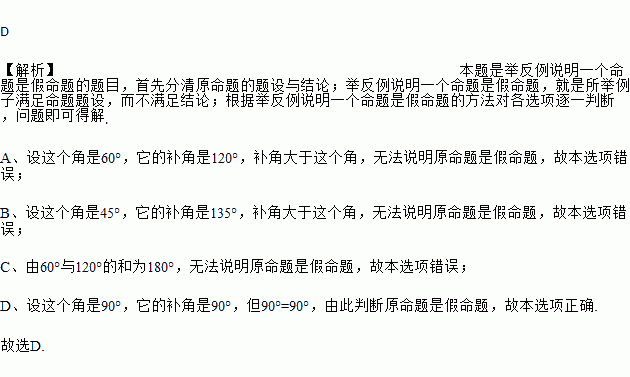 要说明命题“一个角的补角大于这个角”是假命题的反例是( )