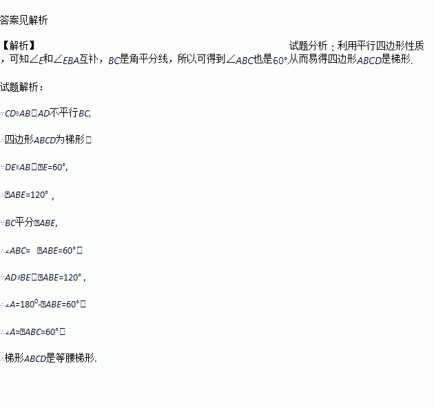 如图,在四边形ABED中,AD∥BE,AB∥ED,∠E=60°,∠ABE的平分线交DE于C.四边形ABCD是等腰梯形吗?为什么?