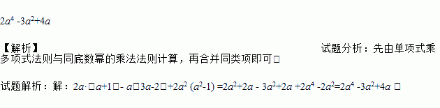 2a4 -3a2+4a 【解析】试题分析:先由单项式乘多项式法则与同底数幂的乘法法则计算,再合并同类项即可. 试题解析:【解析】 2a·(a+1)- a(3a-2)+2a2 (a2-1) =2a2+2a - 3a2+2a +2a4 -2a2=2a4 -3a2+4a .