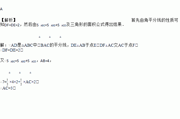 如图,AD是△ABC中∠BAC的角平分线,DE⊥AB于点E,S△ABC=7,DE=2,AB=4,则AC长是( )