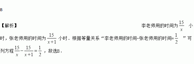 张老师和李老师同时从学校出发,步行15千米去县城购买书籍,张老师比李老师每小时多走1千米,结果比李老师早到半小时,两位老师每小时各走多少千米?设李老师每小时走x千米 ,依题意,得到的方程是( )